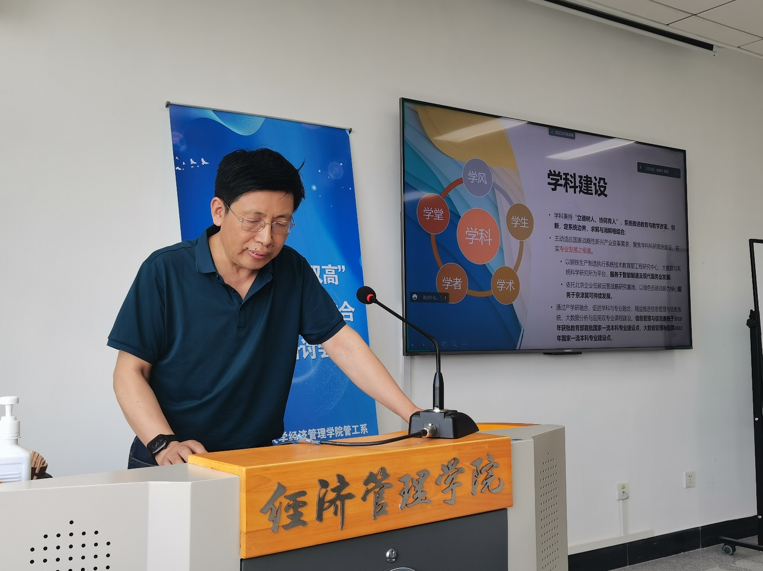 会议由管工系副主任葛泽慧老师主持。系主任兼系党支部书记杨建华老师做了“中国式现代化指导管理科学与工程学科专业建设方向”的主题报告,学科秉持“立德树人”,推进“一芯双翼”协同育人,紧紧围绕制造业高端化、智能化、绿色化发展战略,以及数字产业化、产业数字化转型、产业链供应链现代化等战略需求,面向国家和行业重大科学问题开展学科建设,主动适应国家战略性新兴产业变革需求,聚焦学科科研高地建设,激发老专业新动能,夯实新专业发展之根基,形成了学科前沿驱动,内外双驱、科研创新高地与产教融合创新的特色,实现了学堂创新与知行合一。