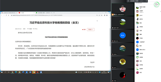2022年4月21日,中共中央总书记、国家主席、中央军委主席习近平在学校建校70周年前夕给北京科技大学老教授们回信,充分肯定了学校自成立以来为我国钢铁工业发展作出的积极贡献,对培养更多高素质人才,促进钢铁产业创新发展、绿色低碳发展提出殷切希望。为深入学习贯彻习近平总书记给学校老教授重要回信精神,根据学校党委统一要求和部署,江南在线客服党委高度重视,及时组织学院全体师生党支部以线上、线下相结合的学习方式开展学习。