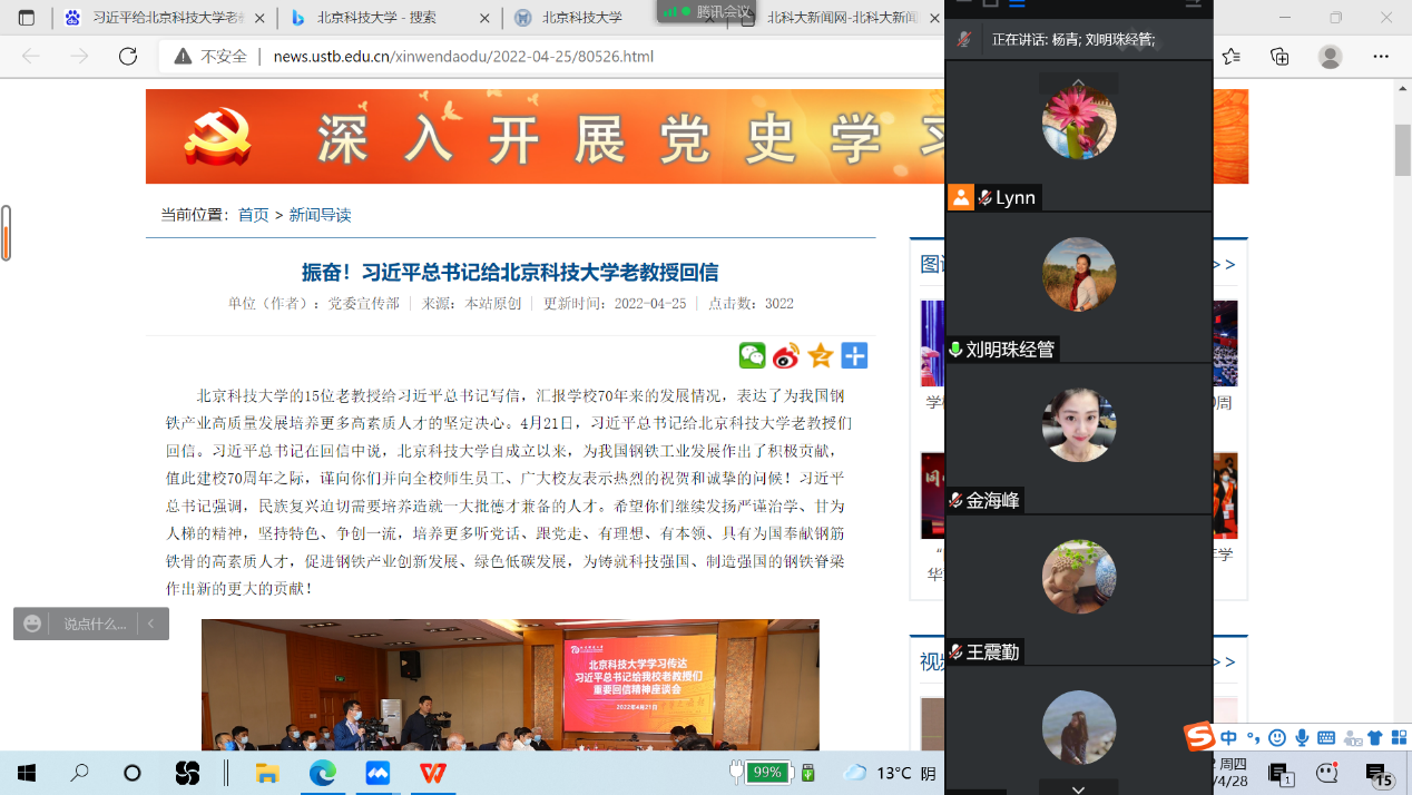 学院党委委员、金融工程系主任、副教授王未卿说,在校庆直播中,听到习总书记给北科大老教授们的回信,作为在北科大工作二十多年的教师,我特别激动,也深受鼓舞,感到责任在肩。忆当年,北科大为国家发展和人才培养,培根铸魂,启智润心;看今朝,立德树人,追求一流,为党育人,为国育才。作为在校教师,我们更要继承和发扬学校老教授的榜样楷模和优良传统,立足岗位,教书育人、薪火传承,在党和国家的时代呼唤下,培育身心具有“钢筋铁骨”的高素质的新一代钢小伙和铁姑娘,为我国钢铁产业的创新发展、绿色低碳发展,奉献力量。我们定会科教强国,不辱使命!