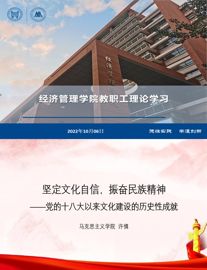 为深入学习贯彻习近平新时代中国特色社会主义思想、党的十九大和十九届历次全会精神,弘扬伟大建党精神,充分宣传展示党和国家事业取得的历史性成就、发生的历史性变革,进一步振奋精神、凝聚力量,在党的二十大召开之际,根据学校党委开展“新时代新成就”宣讲活动的工作安排,2022年10月6日下午,江南在线客服组织全院教职工理论学习,开展《坚定文化自信,振奋民族精神——党的十八大以来文化建设的历史性成就》专题宣讲活动。本次学习活动邀请了学校马克思主义学院许慎副教授做主题宣讲,以线上和线下形式结合进行,学院全体院领导、党委委员和教职工党支部书记在经管楼809参加学习,学院全体教职工在线上参加学习,会议由学院党委书记武森主持。