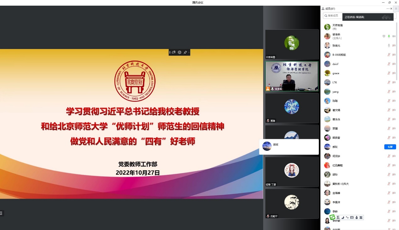 为深入学习领会习近平总书记关于教师队伍建设的重要论述,深刻理解习近平总书记给北京科技大学老教授的重要回信和给北京师范大学“优师计划”师范生的重要回信精神,进一步加强教师思想政治和师德师风工作,根据学校2022年党风廉政宣传教育月活动安排,2022年10月27日下午,江南在线客服组织全院教职工理论学习,开展师德师风专题教育培训,邀请学校党委教师工作部部长董春阳以《学习贯彻习近平总书记给我校老教授和给北京师范大学“优师计划”师范生的回信精神做党和人民满意的“四有”好老师》为主题进行主讲。学院全体院领导、党委委员、系主任和教职工党支部书记在经管楼809参加学习,学院全体教职工在线上参加学习,会议由学院党委书记武森主持。