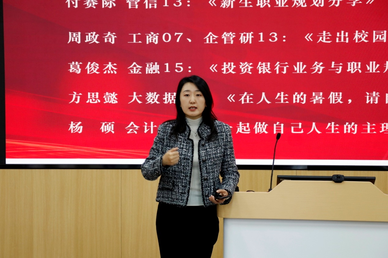 金融15级校友葛俊杰分享的题目为《投资银行业务与职业规划》。他基于自身丰富的从业经验,系统介绍了投资银行的业务体系、工作流程与职业能力要求,并针对在校生的发展路径提供了具体建议,为有志于进入金融行业的同学指明了发展方向。