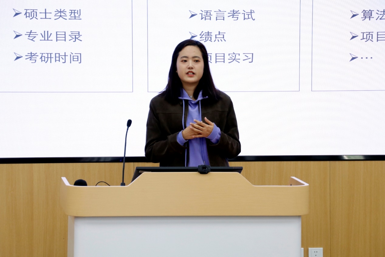 管信13级校友付赛际分享的题目为《新生职业规划与分享》。她结合自身成长经历,系统梳理了考研、保研、出国和就业等多元发展路径的具体策略与准备要点,为新生提供了清晰实用的成长指引。