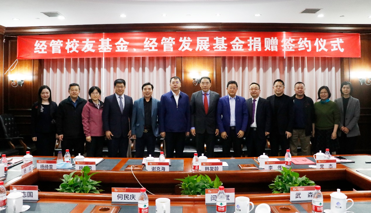捐赠签约仪式上,校友会办公室、基金会办公室副主任杨志国依次与谢克海、林绍荣、管研84班级代表韩复龄、管82班级代表李伟、工贸95班级代表杨绮雯、经管校友会会长谢克海签署了个人及集体捐赠协议,随后闫相斌、何民庆代表学校接受捐赠支票,并向各位校友颁发捐赠证书。