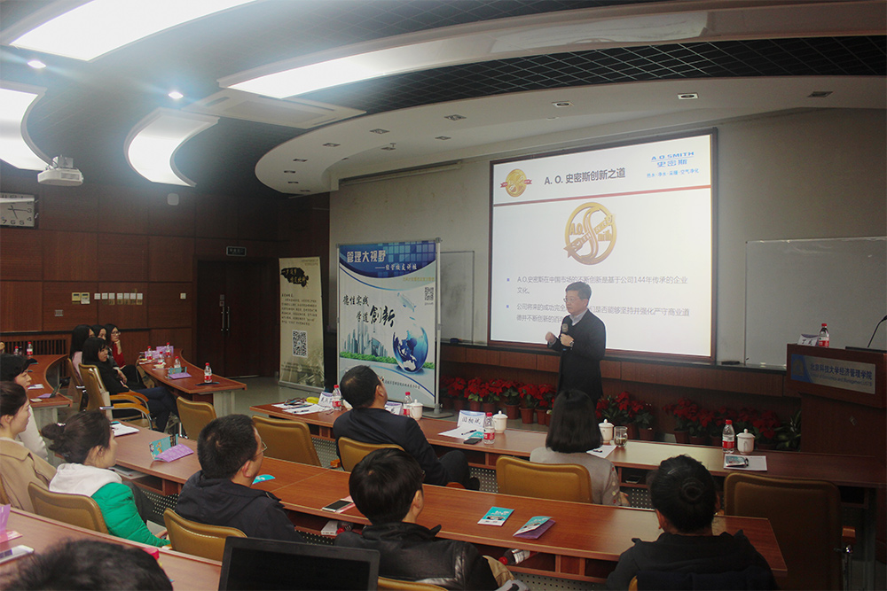 活动开始在下午3:30。学院党委书记戴淑芬教授首先介绍主讲校友和经管校友讲坛系列活动后,讲座开始。丁威校友跟北科大学子们重点分享了A.O.史密斯的成功经验和创新之道。A.O.史密斯公司重视研发创新、经营效率和经营质量,它的经营业绩,离不开对技术坚持不懈的创新追求和企业文化建设的重视。校友提炼出A.O.史密斯非常重要的一条企业文化价值观就是“四个满意”:客户满意、股东满意、员工满意、社会满意。此外,A.O.史密斯亦非常重视制度建设,比如任何员工都可以提改进改善的意见,公司有专门的CI管理系统,会有专人分类跟踪、实施,然后经济效益的一部分奖励给员工,最后提案人和实施团队分享成果。讲座的最后,丁威校友笑着向参加本次讲座的学生发出邀请,希望感兴趣的毕业生能够申请来A.O.史密斯工作。