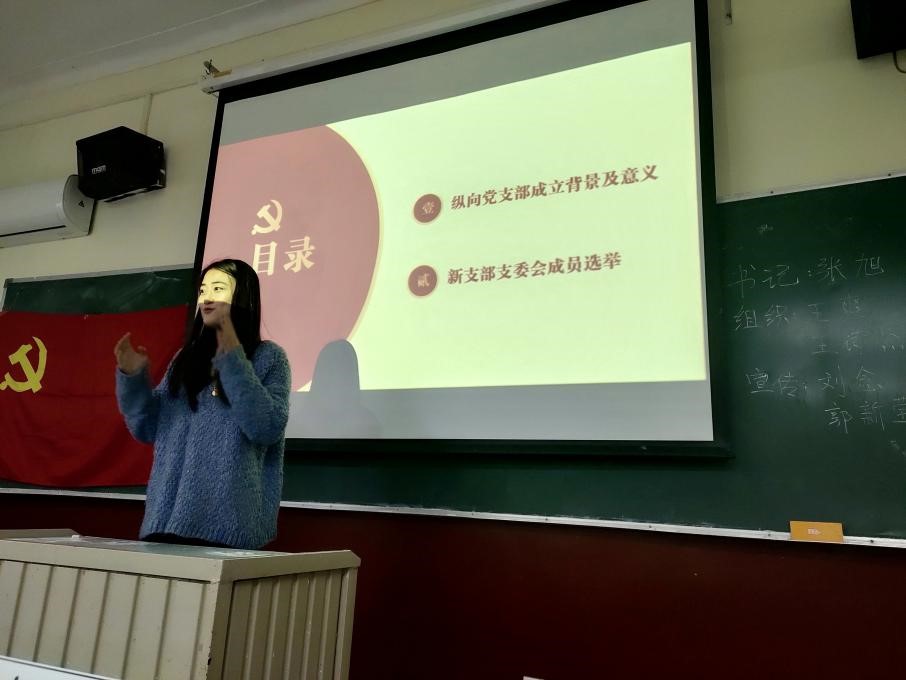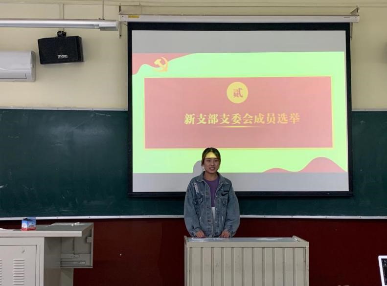 接着进行会议第二项,选举新党支部委员会成员。随后童梦露同志上台发表竞选党支部书记的发言,就其对党支部书记的工作理解、竞选动机、本人经历等方面进行发言,表明成为党支部书记后一定会尽职尽责为支部做贡献。岳菲菲同志上台发表竞选党支部宣传委员的发言,指出自身的优势以及不足,表明为支部服务,为大家服务的决心。潘孝全同志上台发表竞选党支部组织委员的发言,表明自己对入党流程的熟悉,对支部工作负责的态度。