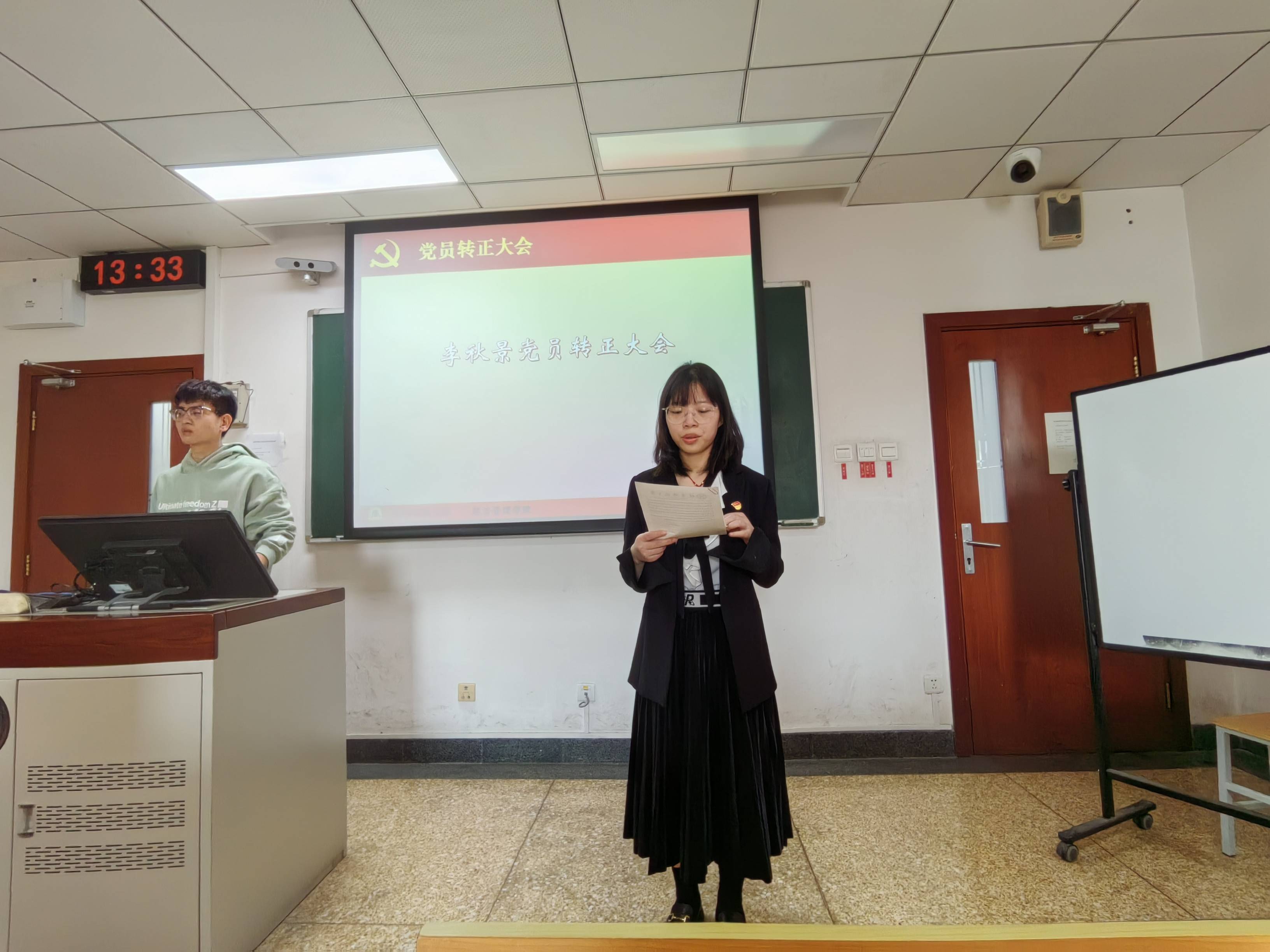 最后,大会提名杨润涵同志为监票人,郭雨琦同志为计票人,由正式党员进行现场无记名投票。支部书记张晓涛同志宣读投票结果:本次未到场有表决权的党员共提交书面意见3份,均为同意。到场有表决权的党员14名,均为同意,共计17名正式党员一致同意李秋景同志按期转正。参会人员纷纷鼓掌表示祝贺。李秋景同志表示,感谢支部同志的信任,成为中共正式党员后会继续努力,严格要求自己,发挥党员的先锋模范作用。