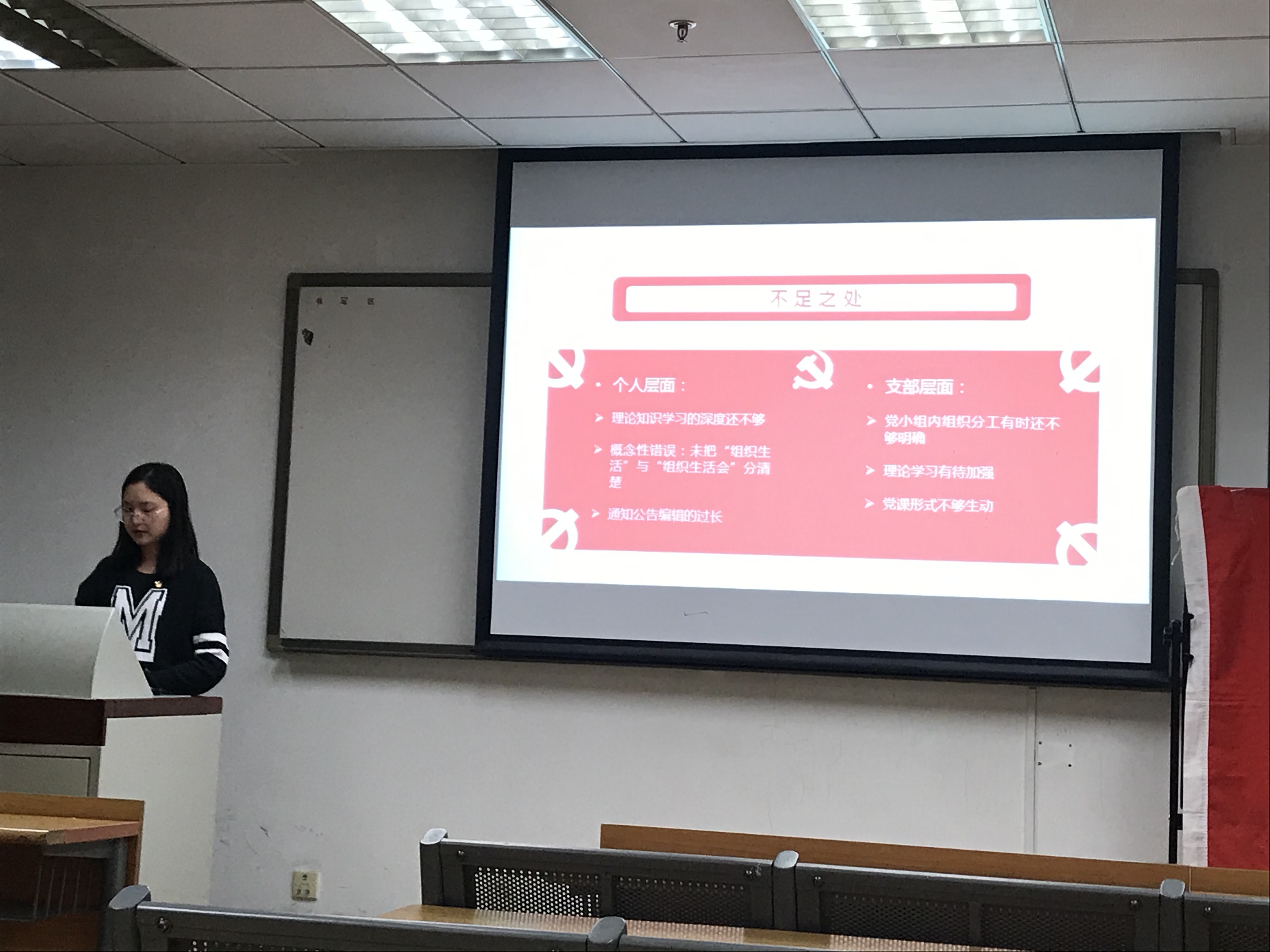 会上参会党员以此上台对自身在学习、生活、修德等各个方面进行了认真的汇报与自我批评,总结了半年以来自己在各方面取得的进步,并深刻思考了自己的不足和缺点,在会上进行自我批评并向大家汇报日后改正的措施及努力方向。