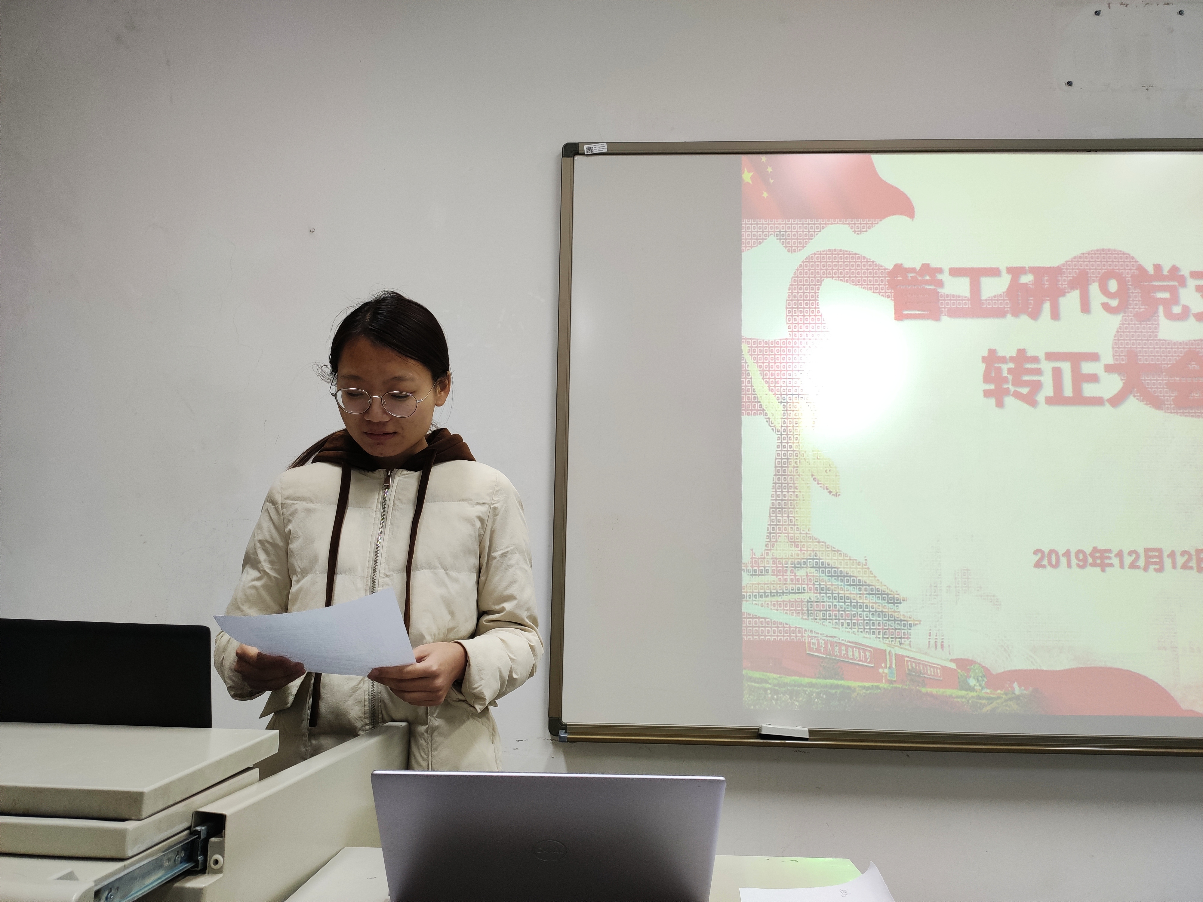 12月12日,东凌江南在线客服管工研19级党支部在管楼310顺利召开了中共预备党员转正大会暨“不忘初心、牢记使命”主题观影活动,党支部书记尹香婷主持本次活动。