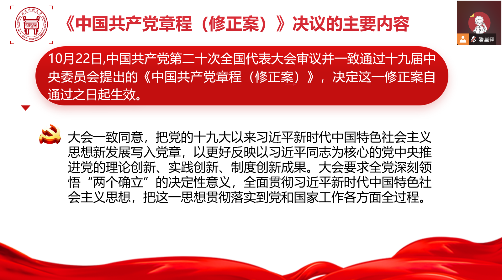 随后,与会同志学习了《中国共产党章程(修正案)》决议的主要内容。党的二十大通过的《中国共产党章程(修正案)》,对习近平新时代中国特色社会主义思想的科学内涵和历史定位作了充实完善,蕴含着党的十九大以来党的理论创新、实践创新、制度创新成果,充分体现了马克思主义中国化时代化最新成果,对统一全党意志和行动,深入推进新时代党的建设新的伟大工程具有十分重大的意义。支部成员一致表示,要把学习党章和学习党的二十大精神紧密结合,深刻领会党章修正案的主要内容,贯彻党章、维护党章。
