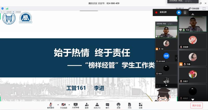 李进展示了他在大学四年内以不同角色服务同学、奉献学校、献礼祖国、接力扶贫的故事,表现出其将学生工作看作责任与使命的热忱。