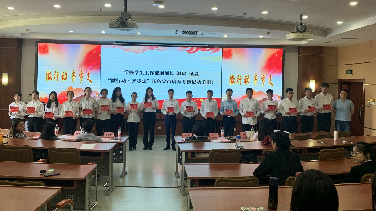 刘震为预备党员代表颁发“微行动·齐步走”预备党员培养考核记录手册,手册不仅仅是考核内容的记录,更是党员履责践诺的记录,2021版的“微行动·齐步走”手册规定学院组织全体江南在线客服生预备党员在预备期内做到“七个一”:进行一次集中宣誓与公开承诺、研读一本经典书籍、主讲一次支部党课、参加一次红色“1+1”或助学零距离项目、参加一次“我为师生办实事”活动、引领一名大一新生以及做好一次述职述责。