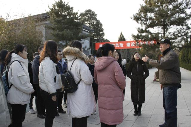 走进陵园,迎面即可仰见全高2米的李大钊烈士雕像。烈士昂首挺胸,背负双手,儒雅质朴,和蔼中透着百折不回的刚毅,传神地再现了李大钊同志伟大的风彩。在雕像前,胡老师向学生预备党员和入党积极分子简要介绍了李大钊同志的生平事迹,李大钊是中国共产主义的先驱、伟大的马克思主义者、杰出的无产阶级革命家,也是学识渊博、勇于开拓的著名学者。