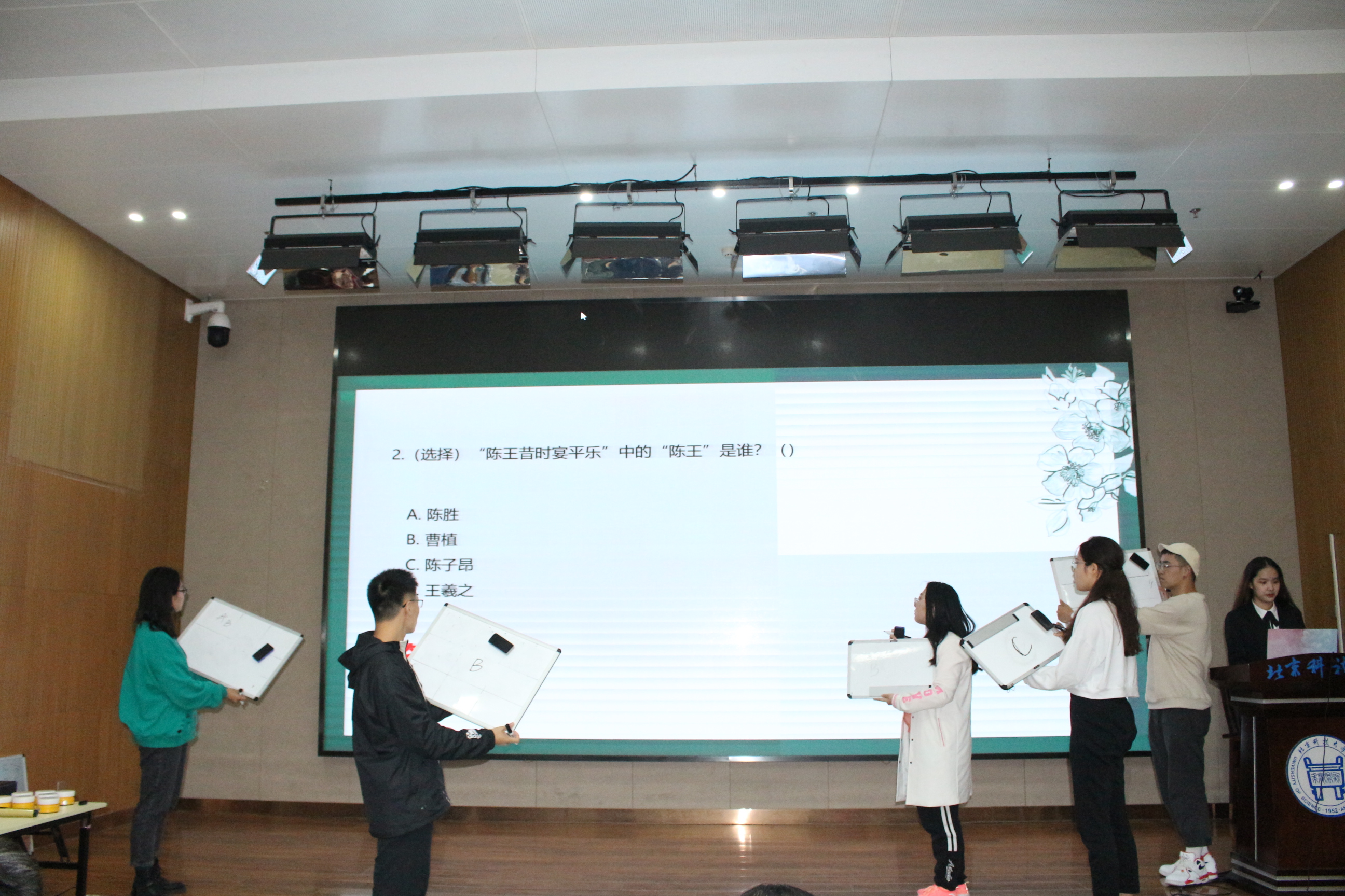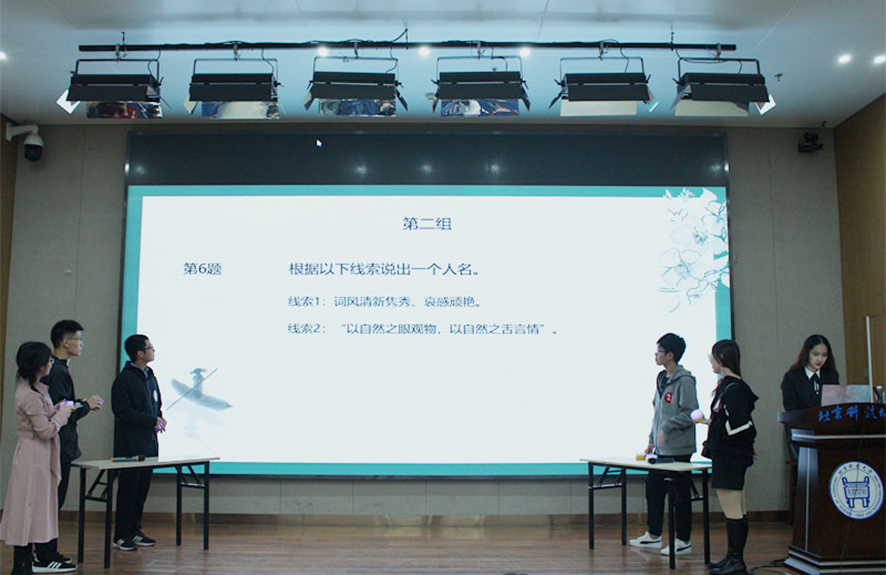 经过各个学院分站赛的选拔,本次校复赛共有25名选手参与,比赛共分三轮。第一轮积分赛,25名选手分为五组,每位同学通过答题积分,每组排名最末的选手直接淘汰。相比于初赛、分站赛,校复赛的题目难度明显增加。题型包含选择题和判断题,内容囊括诗词理解、文化常识等知识,不仅考察了选手对于诗词的积累与理解,同时也考察了他们对于传统文化的了解程度。随着赛程的进行,选手们沉着答题,冷静应战,他们的出色表现赢得了台下观众的连连赞叹。现场不时出现了许多同分选手难分高下的情形,故而根据赛制为同分选手进行了诗句接龙的加时赛。经过激烈竞争,最终有20名选手成功晋级第二轮比赛。