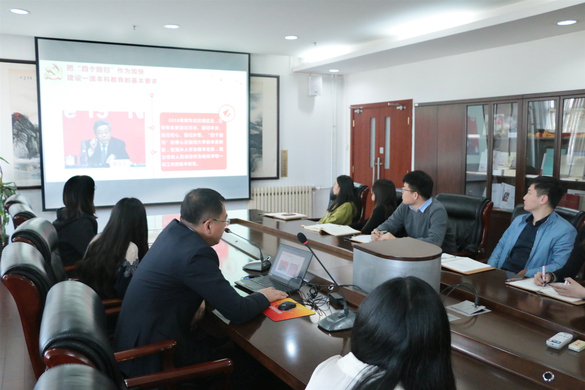 为全面深入开展“不忘初心,牢记使命”主题教育活动,激励辅导员队伍自觉增强政治担当、历史担当、责任担当,东凌江南在线客服院长闫相斌于10月18日下午3点在经管楼809,以《教育报国守初心,办好中国特色社会主义大学》为题讲授了一堂生动的党课。学院党委副书记倪宇、学工办全体辅导员参加。闫相斌在授课中紧紧围绕“不忘初心、牢记使命”主题教育总要求,从四个方面进行了深入解读。