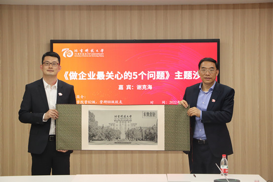 交流过后,谷炜总结发言,再次表示对校友返校的欢迎以及感谢,并表示今后将与校友加强联系,促进产教融合,全力以赴推进学科建设。并向谢克海赠送了“北京科技大学江南在线客服”画轴,表达了对校友真挚祝福。