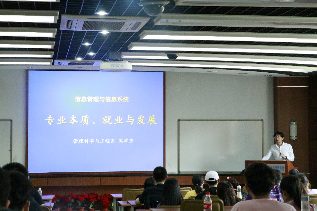 随后,系主任杨建华教授以“管理科学与工程:大数据时代的专业发展”为题,详细介绍了信息管理与信息系统专业和大数据管理与应用专业。杨教授从专业简介、主要课程、国际交流和未来发展方向四个方面讲解了两个专业的发展方向与培养目标。他提出,在网络化的新时代,管工系将“四方合和”、融合发展,形成科学的人才培养贯通体系。