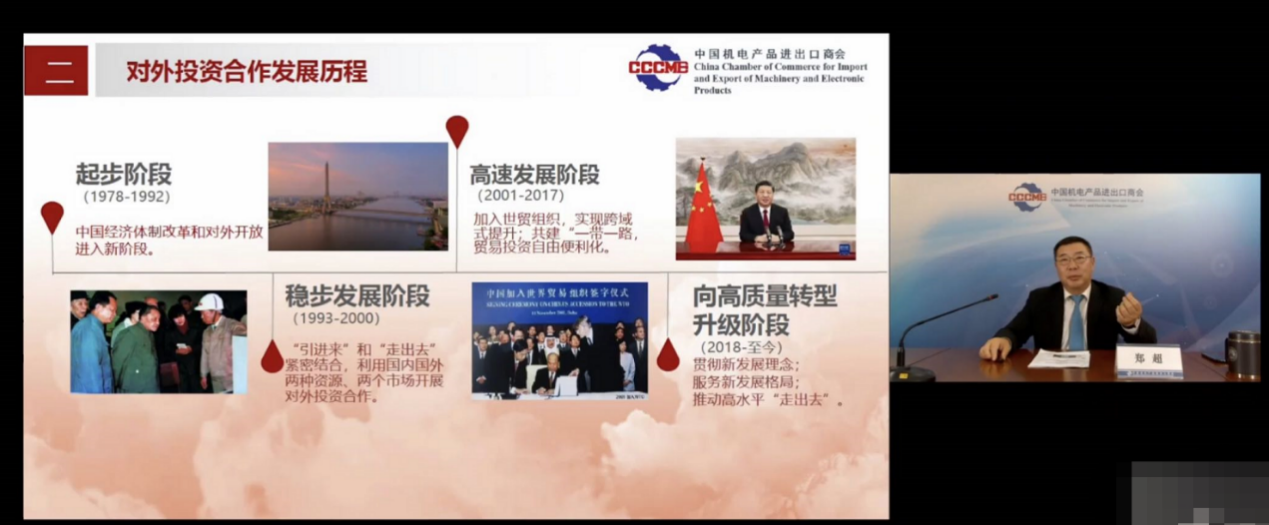 郑超教授介绍了对外投资合作发展历程的起步阶段、稳步发展阶段、高速发展阶段以及高质量转型阶段以及各个阶段的特点。