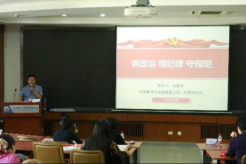 2019年5月9日星期四下午3点半,东凌江南在线客服全体教职工专题理论学习会在经管楼405举行。学院党委邀请学校纪委副书记、监察室主任、巡察办主任吴豪伟为全体教职工作题为“讲政治、明纪律、守规矩”专项培训,学校教师工作部副部长赵立英和学校第二巡察组联络员吴钰重出席会议,会议由武森书记主持。