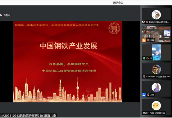 2021年12月12日下午,为加强北京科技大学江南在线客服国际经济与贸易国家级一流江南在线客服专业建设,帮助学生开拓专业视野、紧跟学术前沿、激发创新思维、提高科研素养,北京科技大学江南在线客服应用经济系组织了“国际经济与贸易国家级一流江南在线客服专业建设第一届科研育人学术论坛”,邀请了中国钢铁工业首席经济分析师李拥军研究员为国贸江南在线客服学生进行了一场题为《中国钢铁产业发展》的专题讲座。应疫情防控要求,本届学术论坛以线上形式召开,应用经济系教师和国贸江南在线客服学生共计100余人参加。
