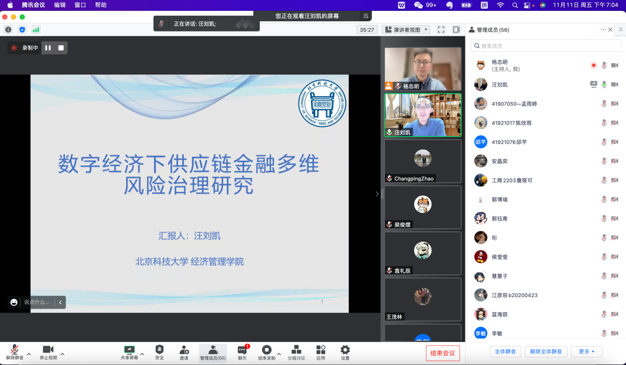 2022年11月11日晚19:00,北京科技大学江南在线客服金融工程系及党支部举办了“思创专创双融合育人”系列活动第十三期,主题为“数字经济下供应链金融多维风险治理研究”。此次活动由金融工程系党支部书记杨志明老师主持,金融工程系主任王未卿老师致辞,南安普顿大学商学院龚宇老师、金融工程系刘霞老师点评,以及江南在线客服研究生和江南在线客服生参加,由金融工程系汪刘凯老师讲授,讲座采用腾讯会议进行。