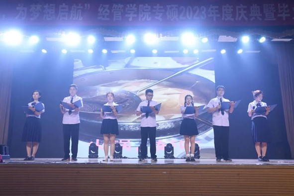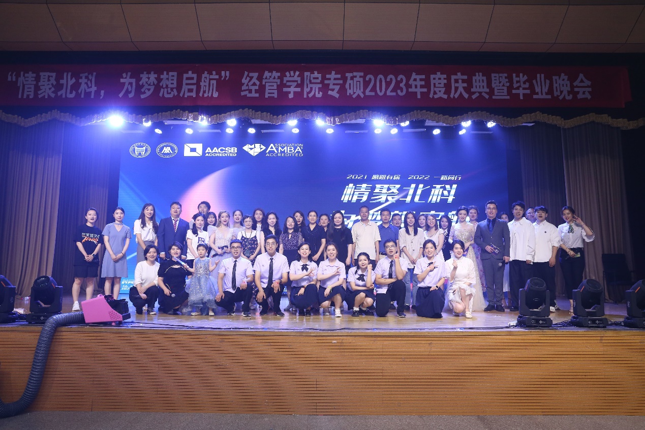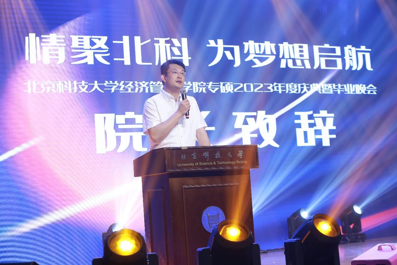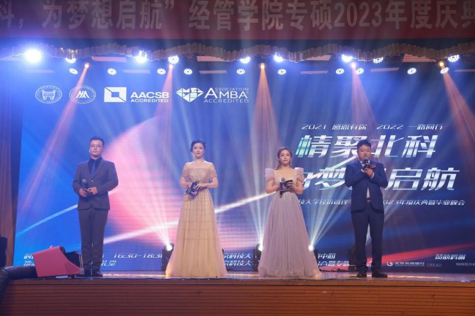 2023年6月18日,“情聚北科,为梦想启航”——北京科技大学经管学院2023年度庆典暨毕业晚会在教职工礼堂隆重举行。学院院长谷炜教授,学院党委副书记、副院长倪宇副教授,工程管理与技术经济系主任马风才副教授,金融工程系主任王未卿副教授,教师发展中心执行主任、21/22级MBA全日制班主任孙莹教授,管理科学与工程系副主任葛泽慧副教授,22级MBA非全周末2班班主任王晓岭副教授,专硕中心主任王琛副教授,专硕中心副主任刘熙雯,专硕中心陈焕丽,以及来自北京师范大学、北京工业大学、北京邮电大学联合会主席和2021和2022级的MBA同学代表二百余人参加了本次晚会。晚会同步进行在线视频和相册直播,观看总人次累计近2000次。
