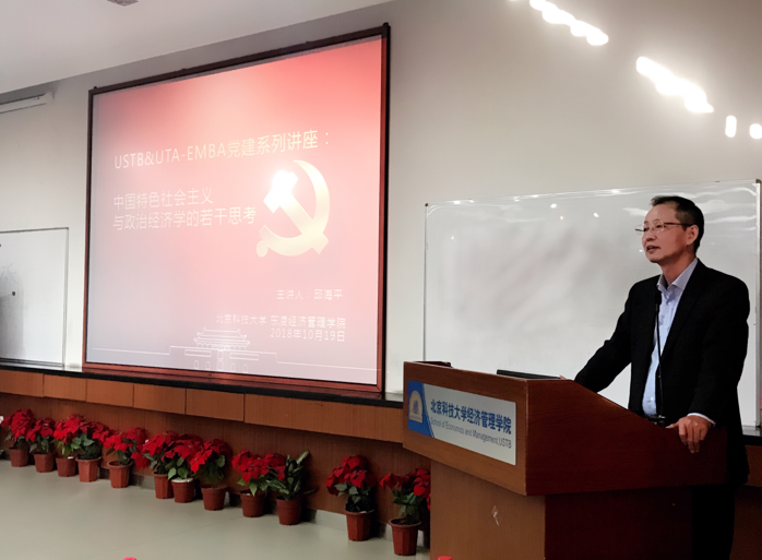 10月19日下午,中国人民大学经济学院邱海平教授应邀来经管学院讲学,为中美EMBA项目的学员作了题为“关于中国特色社会主义政治经济学的若干思考”的学术报告。报告由经管学院院长助理赵霞老师主持,共80余人聆听了此次报告。