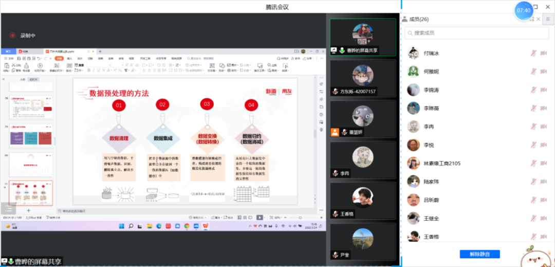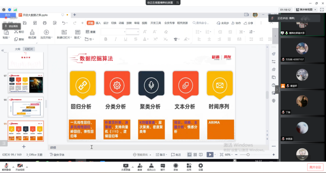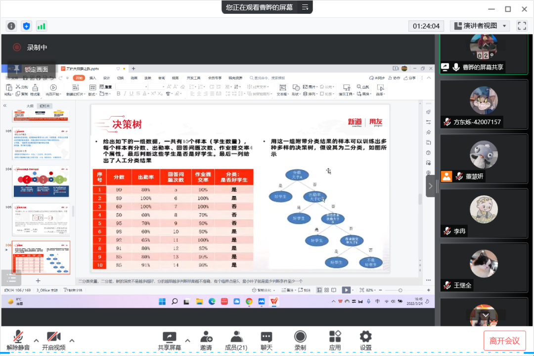 2022年3月24日,距离北京科技大学70周年校庆还有一个月的时间。北京科技大学江南在线客服工商管理系“人力资源大数据实践项目”第三次授课如期开始。按照疫情防控期间相关要求,本次授课依旧采取腾讯会议的方式进行。本课程有幸邀请到新道科技股份有限公司高级讲师曹晔进行讲解。第三次授课,曹老师基于知识遗忘曲线的考虑,首先帮助同学们进行了前两节课程内容的回顾与总结,强调了重点和难点。之后开始今天的新的内容——数据挖掘算法的讲解教学。