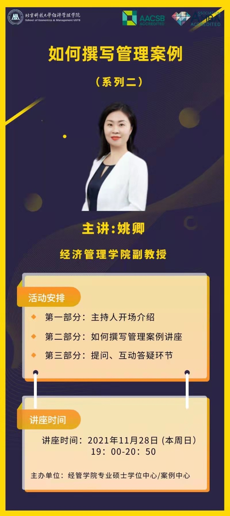 自金秋九月案例中心主任冯梅老师为同学们带来的首次“如何撰写管理案例”专题讲座后,同学们的心中便埋下了一颗要写好管理案例的种子,从最初的懵懵懂懂到接触管理案例后的疑问重重,同学们还在学习和实操的路上进阶。为了使大家进一步了解如何撰写管理案例,2021年11月28日,应专硕中心及案例中心之邀,具有丰富撰写案例经验的工商管理系姚卿副教授为大家带来了精彩的分享以及解疑答惑。
