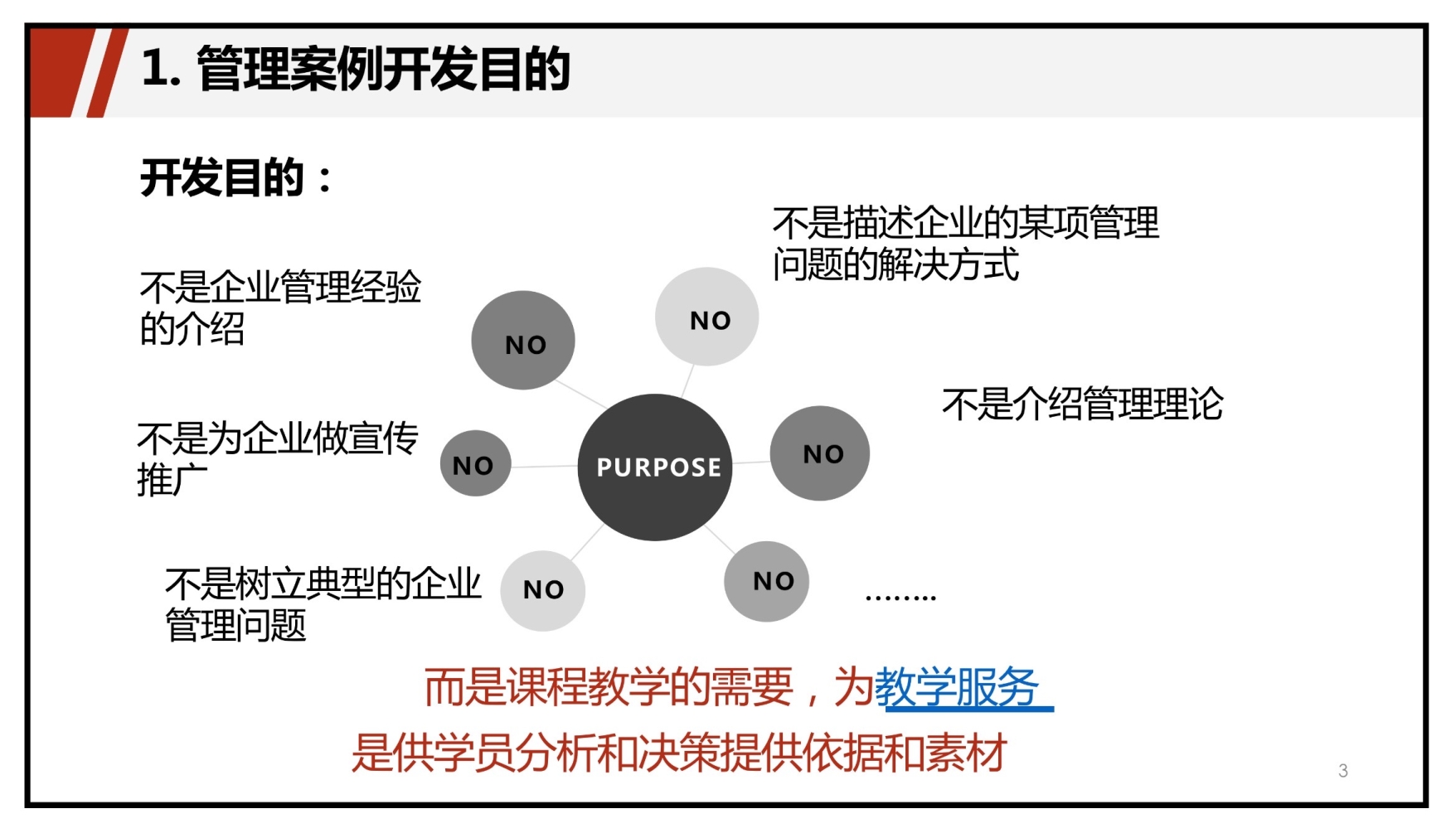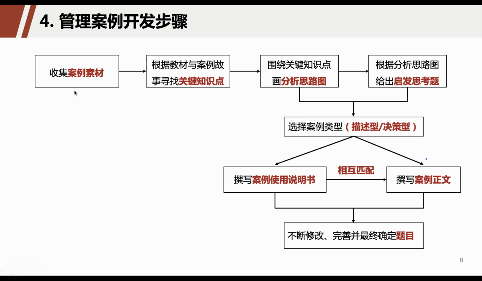 明顺序、进正途。老师重点讲述了案例开发的每个步骤,帮同学们理清了案例正文与案例说明的关系、明确了案例撰写顺序,纠正了同学们认为先写案例正文再写案例说明的误区。案例正文和案例说明是相互匹配的,首先要根据收集到的案例素材明确关键知识点,其次画出分析思路图、给出启发思考题,据此决定案例的类型。最后进行案例说明与案例正文的撰写并不断修改、完善,最终确定题目。