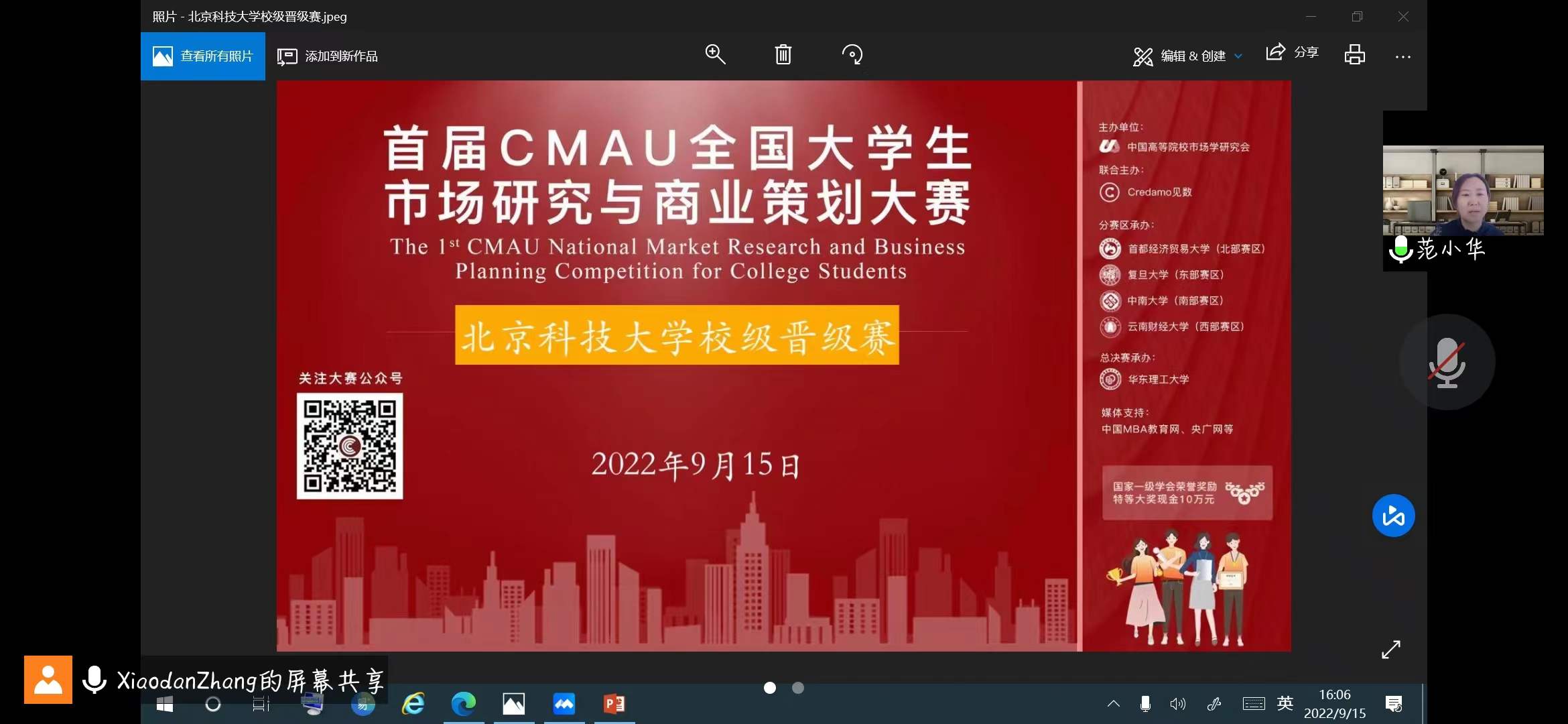 9月15日,由中国高校市场学研究会(CMAU)和Credamo见数科技公司主办,北京科技大学江南在线客服工商管理系承办的首届CMAU全国大学生市场研究与商业策划大赛北京科技大学校级选拔赛举行。本次比赛以线上线下相结合的形式进行,江南在线客服副院长范小华和工商管理系主任张剑出席本次活动并致辞发言。工商管理系老师胡玲、苏玲、姚卿、邹鹏担任评委,张晓丹老师主持。