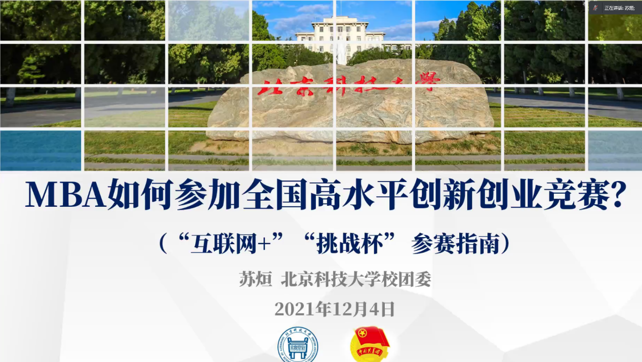 2021年12月4日晚,由经管学院专硕中心主办的“创新创业三大赛事”权威解读活动通过腾讯会议线上平台成功举办,学院创新创业辅导员戈誉阳作为讲座主持人,邀请了北京科技大学校团委副书记苏烜老师对竞赛政策进行了专业解读,2018级MBA校友肖祥应分享了MBA参赛经验和创业经历,孟子居创业团队创始人、负责人杨国庆作为获奖团队代表分享了参赛心得。专硕中心王琛老师、陈欢老师以及近70名专硕同学共同参会。一个半小时的解读,为参会同学诠释了什么是创新创业三大赛、为什么三大赛含金量如此之高、参赛带来的众多收获,极大提高了同学们参赛热情。