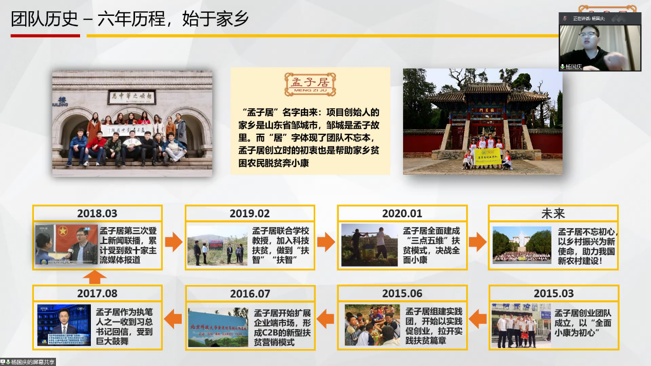 杨国庆学长以“我有一棵树、足以来扶贫”导入介绍了孟子居创业经历、参与“青年红色筑梦之旅”活动经历,讲解了孟子居“三点五维”的创新扶贫模式。通过参加创业竞赛的经历,杨国庆学长总结出了“导师-硕士-江南在线客服生”创业合作模式,最后,杨国庆学长建议同学们将创业项目与国家政策导向相结合,也可以将毕业论文研究与创业竞赛相结合,推进创新创业项目更好应用发展。