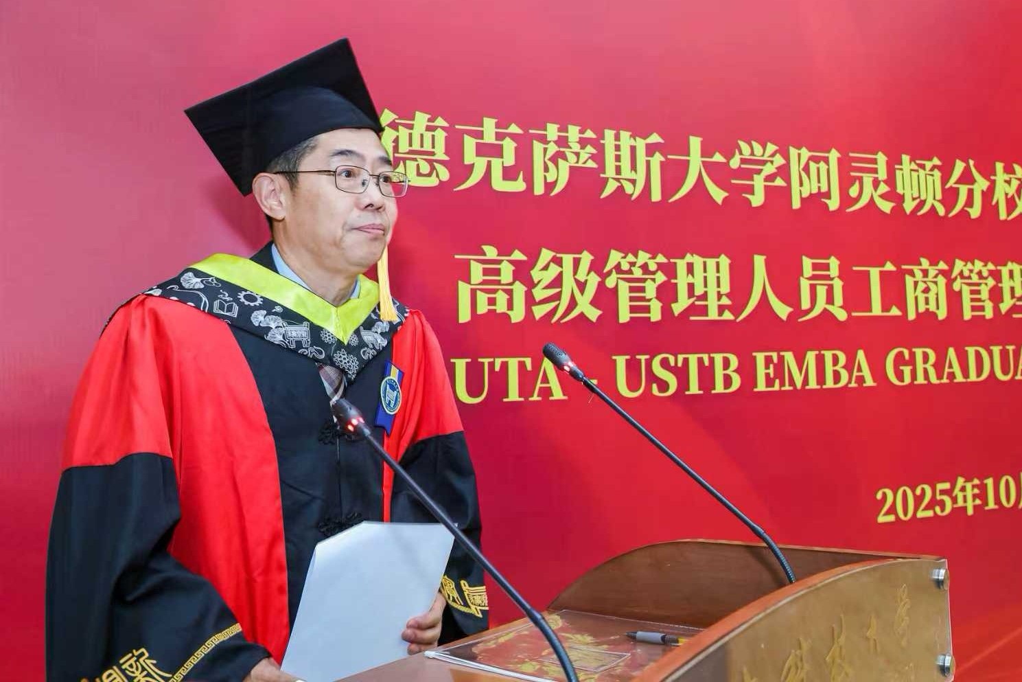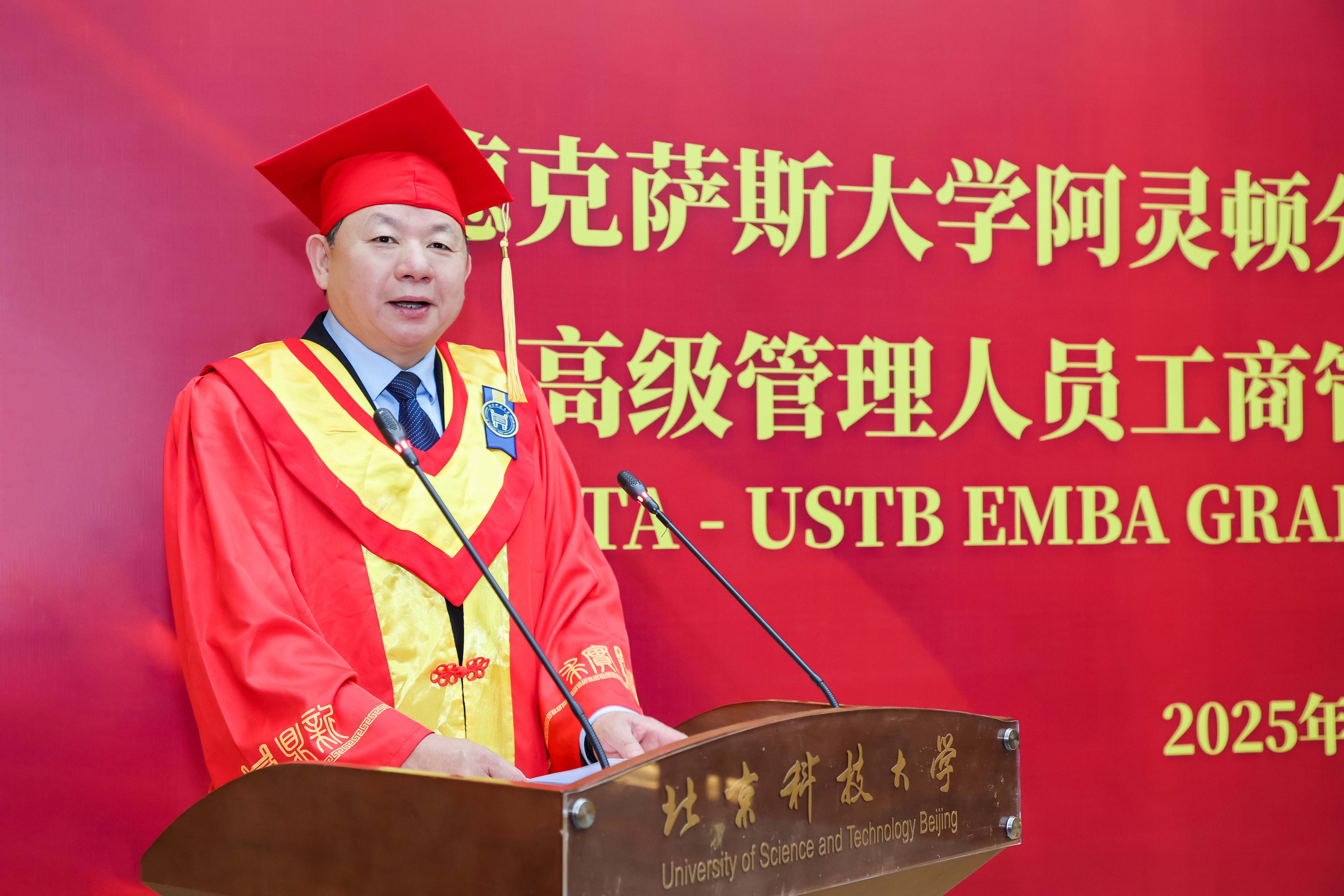 杨仁树向2025届UTA-USTB EMBA毕业生表示热烈祝贺,并向德克萨斯大学阿灵顿分校自2002年至今对学校该学位项目的支持表示衷心感谢。他表示,希望同学们不但要传承学校“求实鼎新”的校训精神、承载经管学院“德性实践,学道创新”的院训精神,更要在未来的生活中胸怀梦想、脚踏实地、行稳致远;希望同学们继续关心支持学校的建设发展,母校永远敞开怀抱,欢迎毕业生回家。