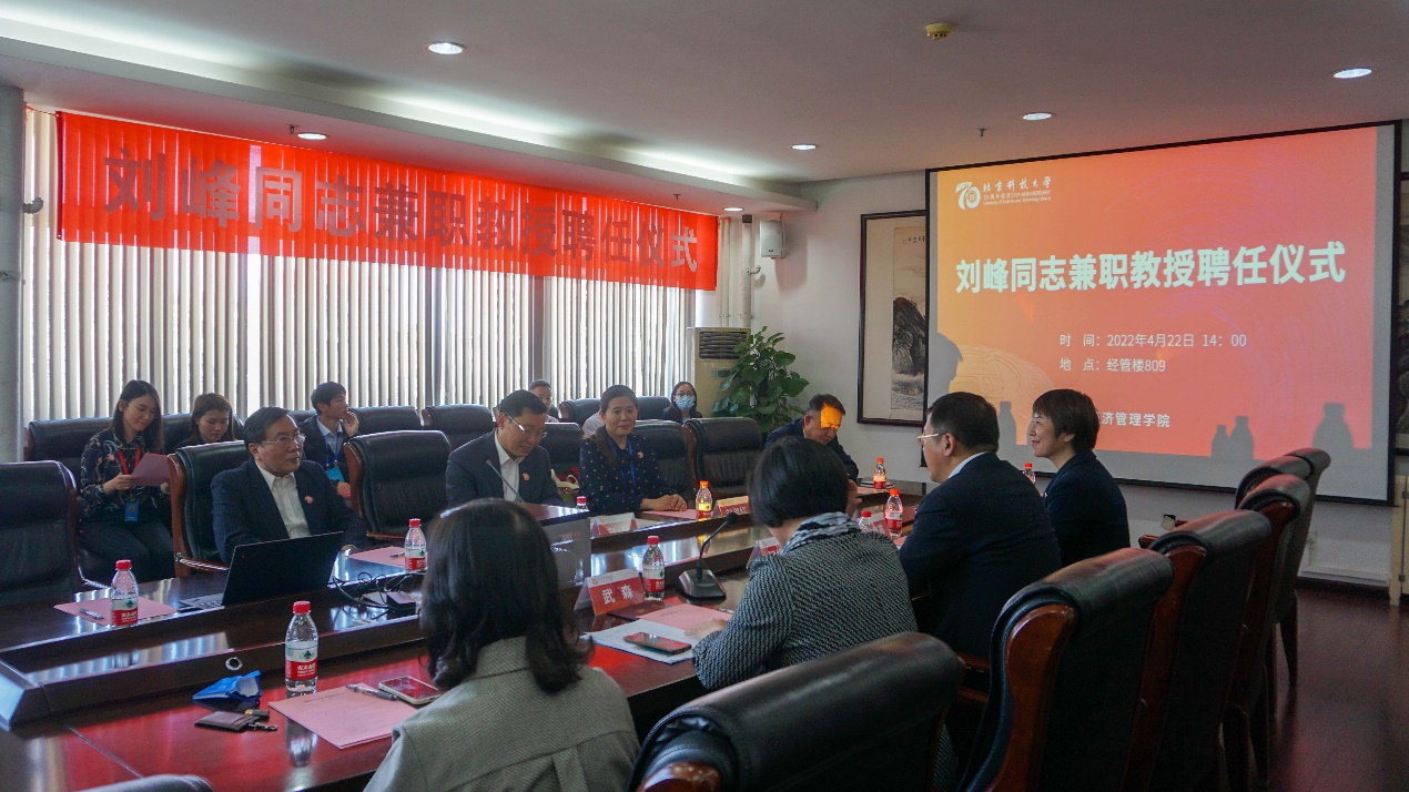 2022年4月22日下午,中国大洋协会秘书长、我校79级校友刘峰同志兼职教授聘任仪式在经管楼809举行。北京科技大学副校长闫相斌出席仪式并为刘峰校友颁发学校兼职教授聘任证书,江南在线客服党委书记武森教授主持聘任仪式。关心下一代工作委员会常务副主任孙铁,离退休职工党委副书记、离退休职工工作处副处长、关心下一代工作委员会秘书长刘淑红,江南在线客服副院长黄晓霞以及学院教师代表到场参加活动。