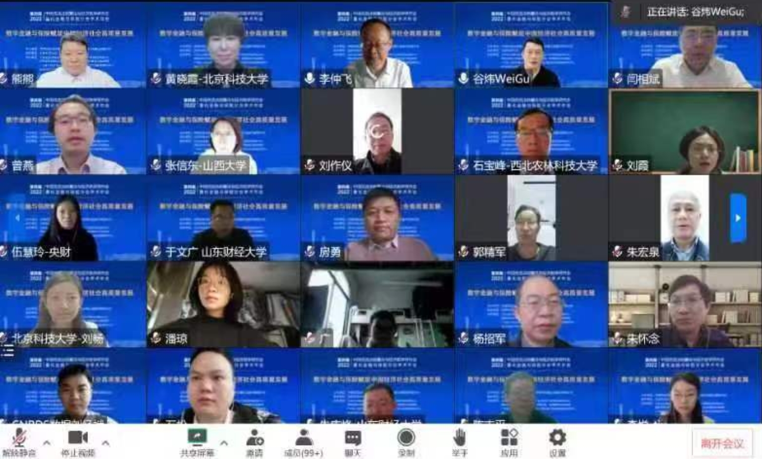 本届年会聚焦“数字金融与保险赋能中国经济社会高质量发展”,旨在深入交流数字金融、金融科技、金融创新、金融安全、大数据金融、互联网金融、金融安全、资产配置、行为金融、养老金融、保险精算等相关领域的重要热点问题。此次学术盛会吸引了来自中国科学院、哥伦比亚大学、约翰霍普金斯大学、佛罗里达大学、香港科技大学、清华大学、北京航空航天大学、北京科技大学、天津大学、对外经济贸易大学、西南财经大学、中央财经大学、上海财经大学、中山大学、南方科技大学、厦门大学、华东师范大学、湖南大学、四川大学、西安交通大学等近70所高校专家和学者以及银河证券和CNRDS的业界专家近800人,通过腾讯会议和直播的方式参加会议,开展学术交流和讨论。