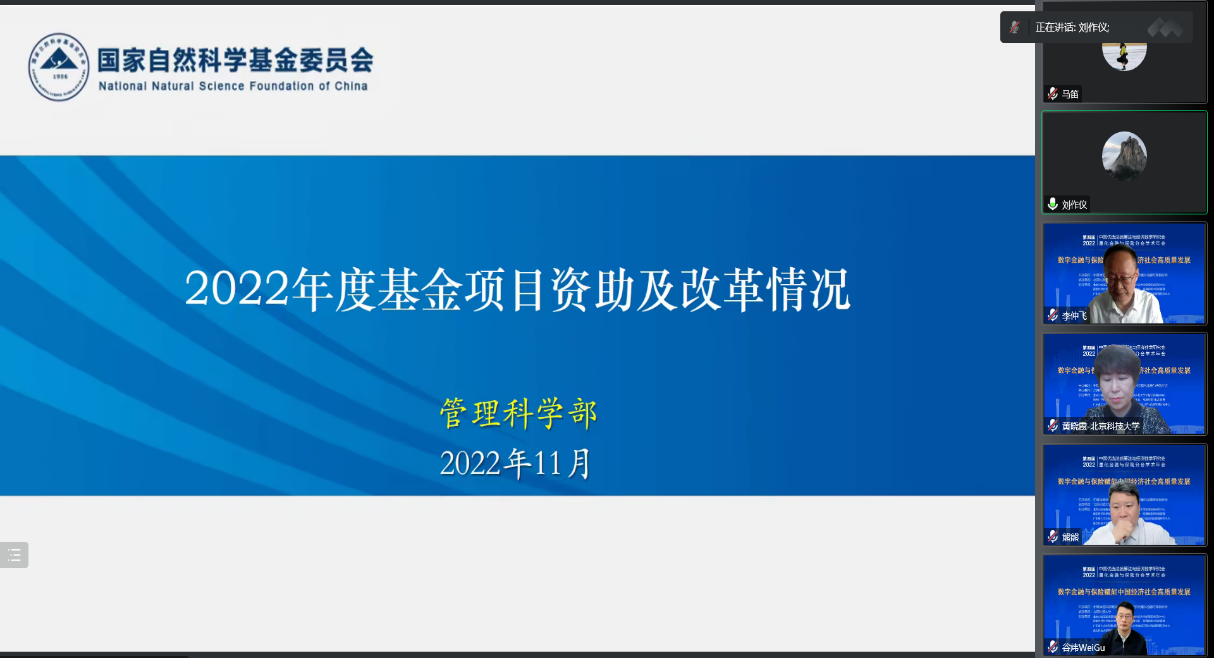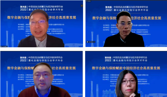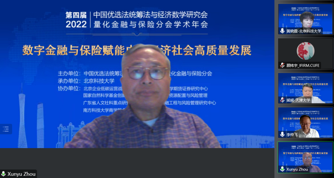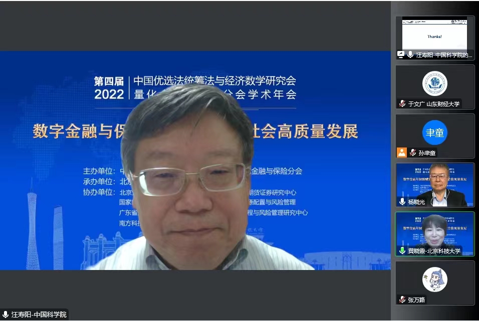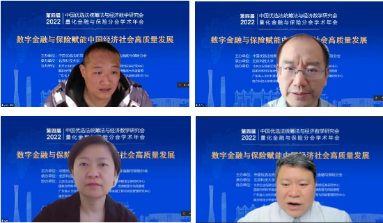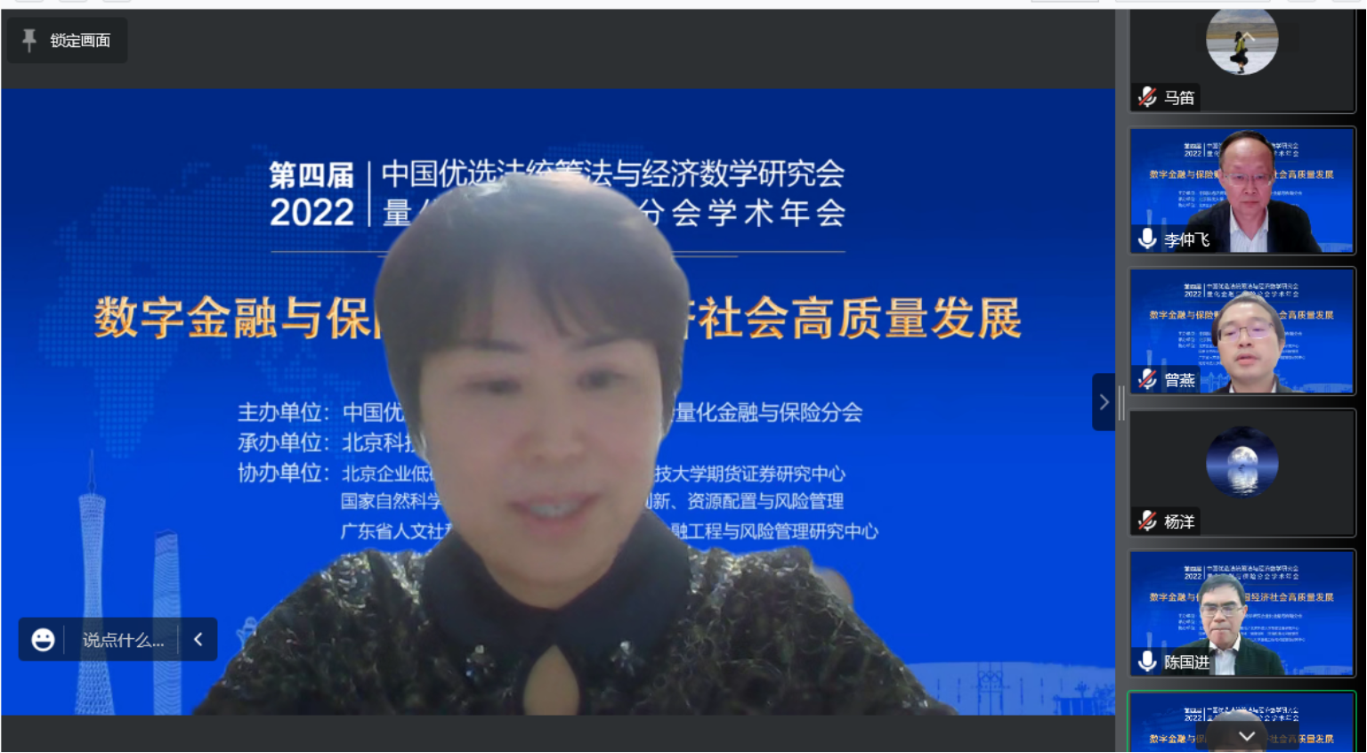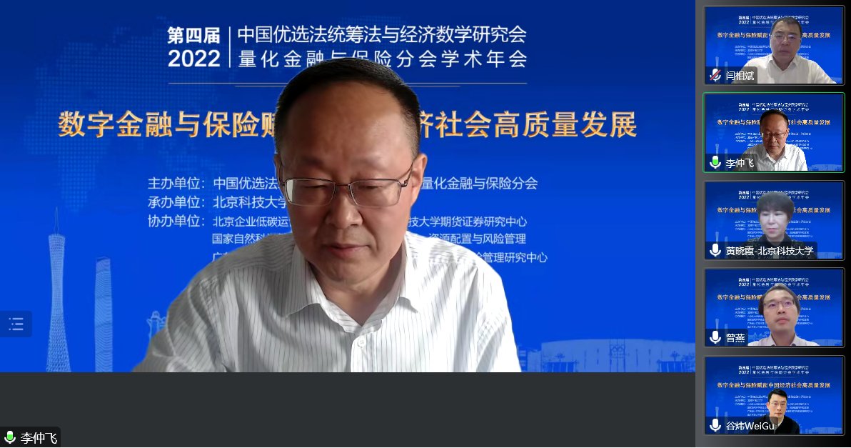 开幕式后,由国家自然科学基金委管理科学部副主任刘作仪、哥伦比亚大学的周迅宇教授、中国科学院的汪寿阳院士和中国科学院系统科学研究所副所长杨晓光研究员作大会报告。首先,刘作仪主任作了题为《2022年度基金项目资助及改革情况》的大会报告,详细介绍了2022年度管理学部基金资助情况和改革情况。然后,周迅宇教授作了题为《ReinforcementLearninginContinuousTimewithFinancialApplications》的大会报告,介绍了无模型连续时间强化学习及其在金融资产管理中的应用。上半场大会报告由大会主席李仲飞理事长主持。汪寿阳教授作了题为《加密货币的几个问题》的大会报告,从比特币挖矿谈起,通过几个案例来分析数字经济时代风险管理的一些新问题,并针对这些新问题,提出新理论、新方法与新技术,促进数字经济风险管理理论的研究与发展。最后,杨晓光研究员作了题为《数字经济的内在逻辑》的大会报告,报告指出了从卖方经济到买方经济的人类行为的变化,使得互联网和信息技术全面赋能经济各个环节,并阐述了数字经济的经济产出中市场和数据要素的重要性。下半场大会报告由北京科技大学江南在线客服副院长黄晓霞教授主持。大会报告内容丰富、精彩纷呈,为参会人员呈现了一场量化金融与保险前沿研究的思想盛宴。大会报告期间通过腾讯会议参与大会报告学习讨论的人数达到了300上限,同时还有近500人通过线上直播的方式参与大会报告的学习。